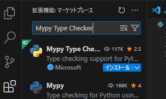 拡張機能を選択し、「Mypy Type Checker」と入力し、インストールしましょう。